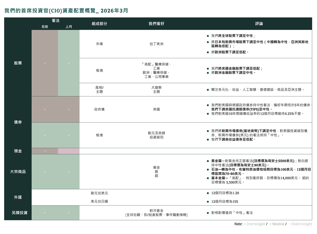 - 新興市場整體由超配下調中性 (亞洲降至低配,中國轉為中性;其餘亞洲市場降至低配;拉丁美洲維持超配)