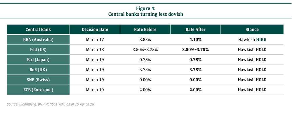 Inflation expectations have picked up, and in response, central banks around the world have started to pivot slightly away from their initially dovish stance, with some even suggesting increasing interest rates to combat rising costs despite the risk to growth. The recent diplomatic developments mark a crucial step away from a severe tail-risk event. Hence, the risks to a prolonged inflationary shock have declined in a meaningful way. This should ease the pressure on central banks in the near term and allow most to adopt a wait-and-see approach. For the Fed, we now expect no further rate cuts this year (from one cut previously), given the upside risk in inflation and a more balanced labour market. For the ECB, we think they will likely remain on hold this year, albeit the risk of a hike towards the end of this year has increased considerably.