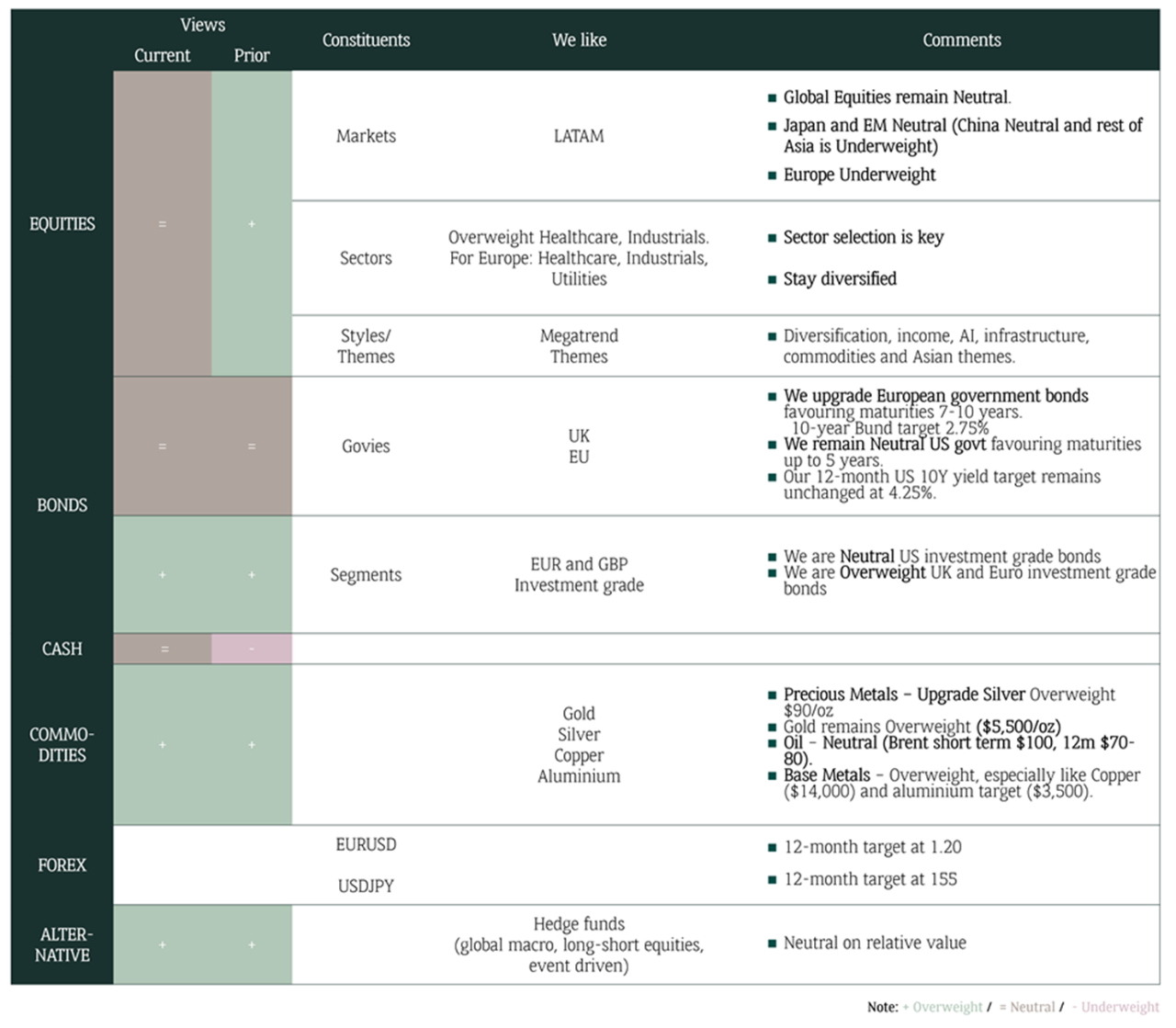 At this juncture, we continue to advocate for a diversified portfolio, with a tilt towards value and defensive for equities. The trend of diversification away from the dollar should resume post-conflict given the likely diversification away from the petrodollars amongst the Gulf Cooperation Council (GCC). The weaker dollar and the possibility of higher inflation (and hence lower real rates) are supportive of gold prices, and we stay Positive with a target price of USD 5,500/oz, while also upgrading our silver view to Positive from Neutral (target price: USD 90/oz). That being said, investors should also continue to prepare a potential buy list of opportunities to act upon if the cloud of uncertainty subsides further. The worst-hit areas (Asia in particular) are likely to benefit the most if we achieve a credible conclusion to this conflict.