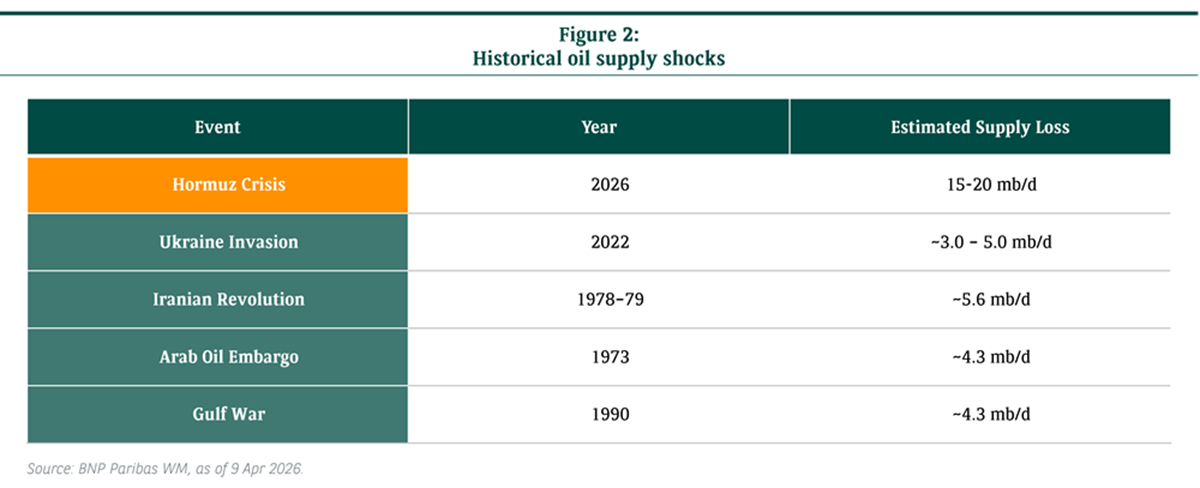 The disruption due to the conflict is now officially the largest oil supply shock in history by volume (see Figure 2). Compared to previous significant supply shock events, where on average the estimated supply loss is approximately 5 million barrels a day (mb/d), the 15-20 mb/d loss (which accounts for roughly 20% of the global oil demand) affected by the closure of the Strait of Hormuz is massive, given there are few viable alternatives to bypass this route. In the short term, Saudi pipelines to the Red Sea, UAE alternative routing, floating oil, sanctions relief and strategic petroleum reserves (SPR) releases is getting the shortage down to 7-10 mb/d, but the clock is ticking.