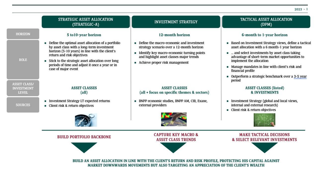 BNP Paribas Wealth Management has defined a global asset allocation process in order to make sure there is a consistency between the Investment strategy scenario as defined by the Investment Strategy and the tactical asset allocation decisions made by the local Asset Allocators. The objective is to ensure clients’ comprehension regarding the global communication of the strategic scenario of Wealth Management and what he sees in his personal mandate.